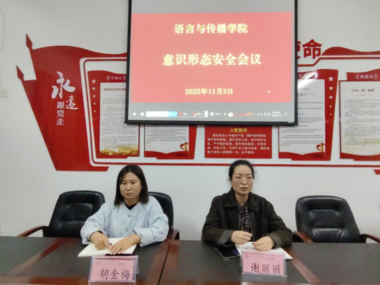 为深入贯彻习近平新时代中国特色社会主义思想,切实筑牢校园意识形态安全防线,11月3日,语言与传播学院(国际教育学院)在学院C401会议室召开意识形态安全专题会议。本次会议由语言与传播学院(国际教育学院)党总支书记谢丽丽主持,学院学生会成员及各班班干部参加会议。