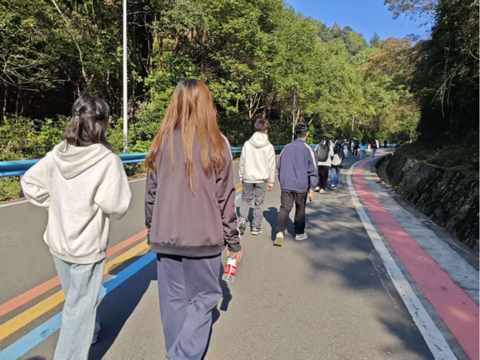 下午1点,志愿者们携垃圾袋、便携水杯在学校南门准时集合,主动互帮互助,氛围热闹有序。乘车抵达仰天岗后,负责人明确登山路线与安全纪律,发起“无痕登山”倡议。登山途中,初秋山林草木清香萦绕,志愿者们或驻足观察野菊、松鼠,或分享学业与志愿经历,遇陡坡时相互帮扶、等候体力较弱的同伴,在半山腰观景台围坐休息、分享零食、记录秋景,陌生成员渐趋熟络。