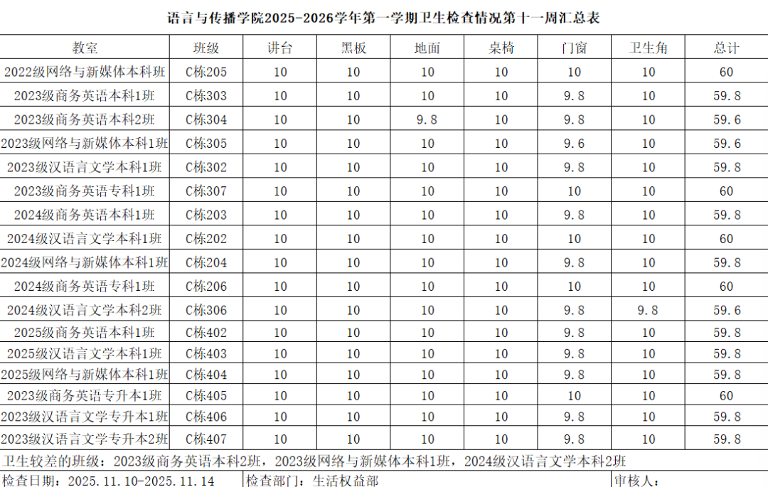 教室卫生检查旨在确保学校教学环境整洁、卫生,为学生提供一个良好的学习氛围。通过定期检查,可以及时发现并解决教室卫生存在的问题,促进学生养成良好的卫生习惯,提高整体教学质量。生活权益部对每个班级按照学校规定的每周检查频率执行。依据学校制定的教室卫生标准,对教室的地面、桌面、黑板、窗户、门、墙面、天花板、垃圾桶及教学设施等进行全面检查。以下是各班第十一周的卫生情况。