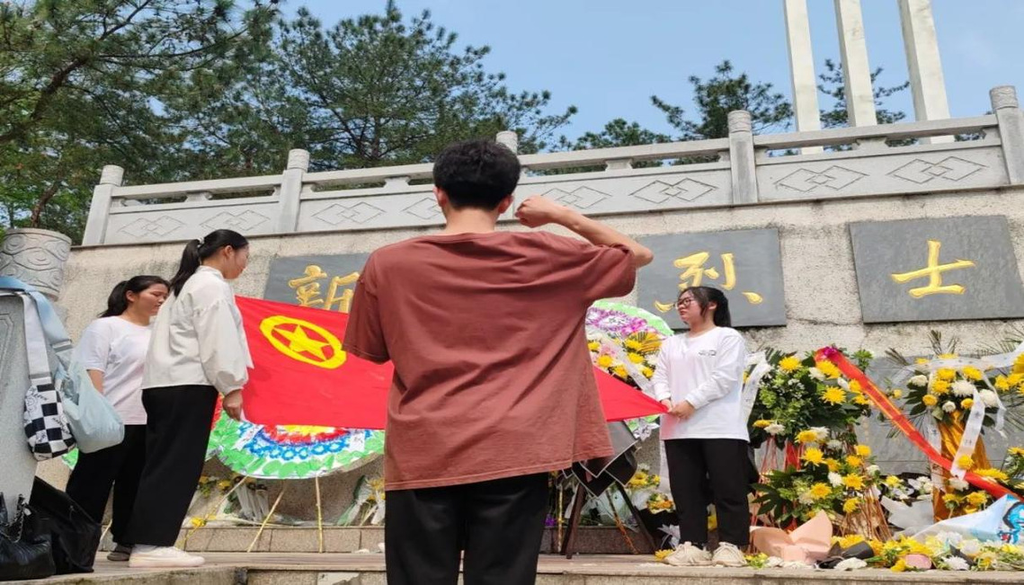 鲜花献英烈,哀思祭忠魂。庄严的陵园里,革命烈士纪念碑巍然耸立,团学干部们双手捧花把它们小心翼翼地放在碑前,像与先烈面对面,献上无限崇敬。