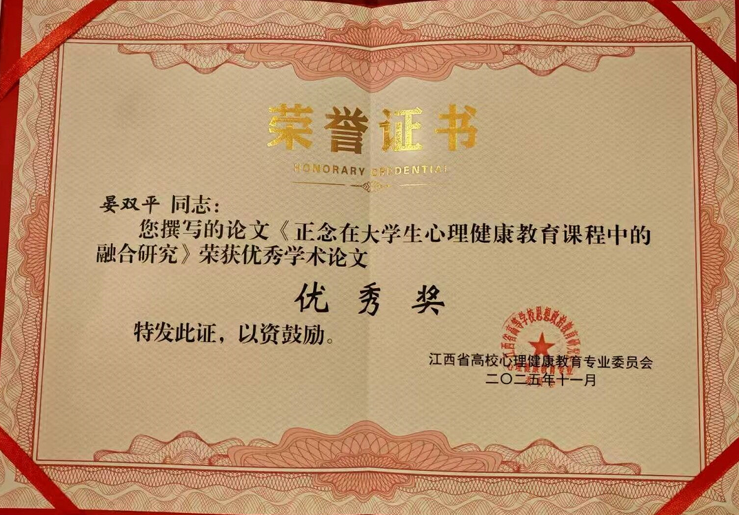 晏双平老师撰写的论文《正念在大学生心理健康教育课程中的融合研究》荣获优秀学术论文“优秀奖”。该论文深入探讨了正念在大学生心理健康教育课程中的应用与融合,为心理健康教育课程的教学改革和创新提供了新的思路和方法,具有较高的理论价值和实践指导意义。