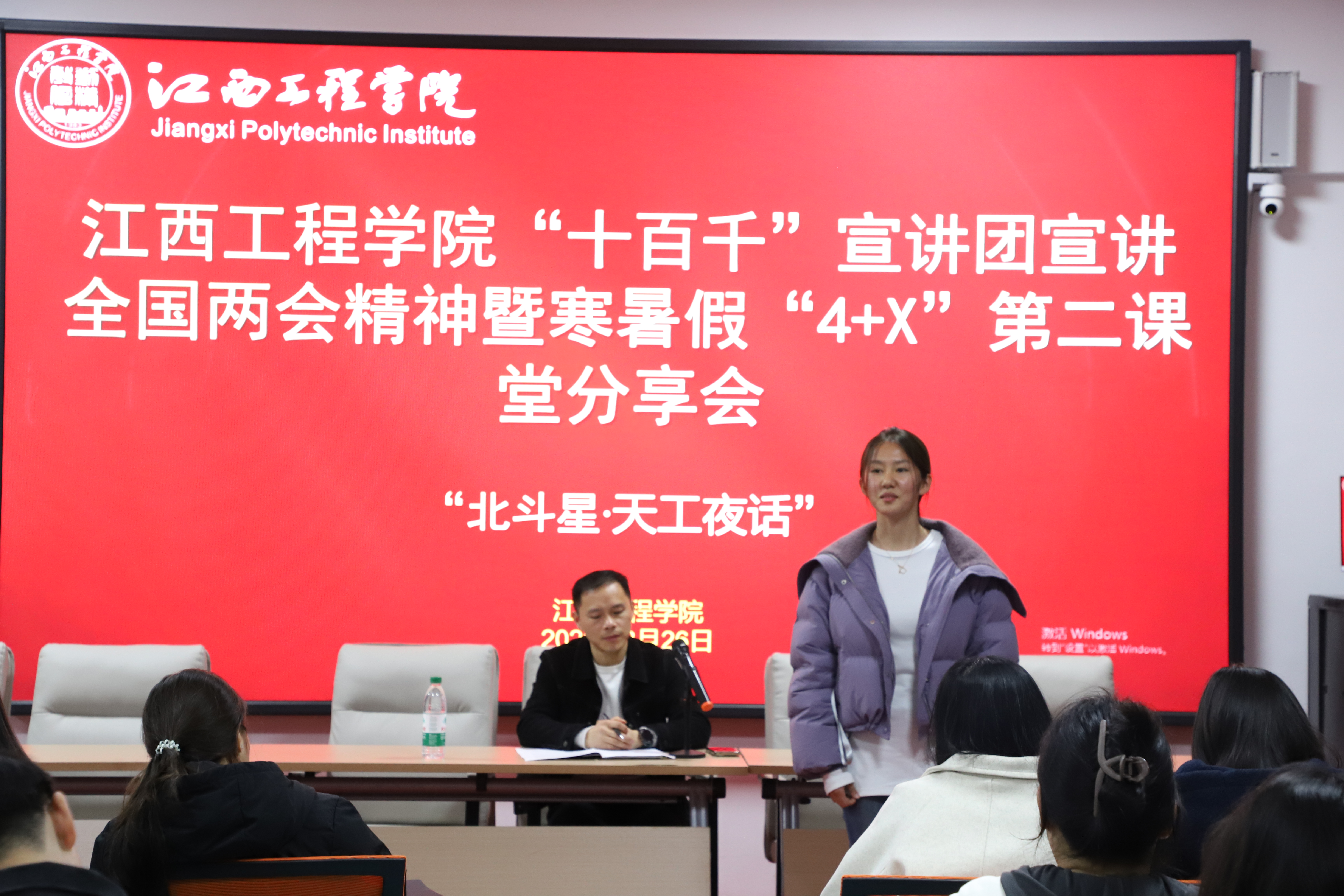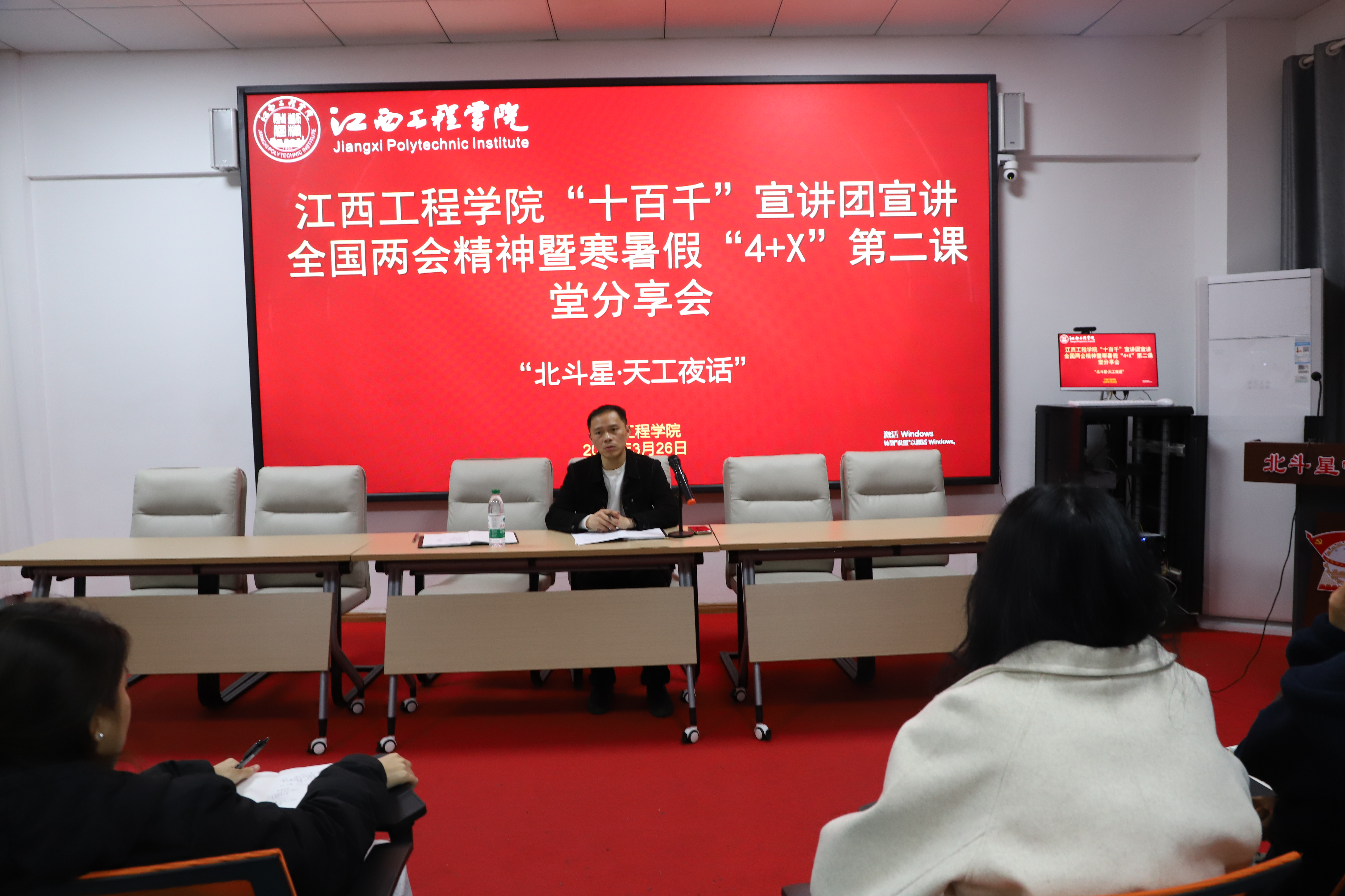 春潮涌动处,奋进正当时。3月27日晚,江西工程学院“一站式”学生社区灯火通明,“北斗星・天工夜话”2026年第1期活动如期举行。本次活动以“全国两会精神宣讲+本科教学工作合格评估动员+寒假‘4+X’实践分享”为核心内容,通过理论解读、政策宣讲、经验交流等形式,为来自抱石艺术学院、经济管理学院等4个学院的60余名团学干部及辅导员代表搭建了思想引领与实践交流的平台。活动由学工部副部长周卫忠主持,马克思主义学院直属党支部书记于永清、辅导员李桃分别作专题宣讲。
