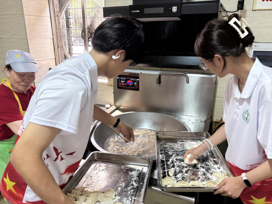 午后,实践队转场至社区广场,组织了一系列多元化活动。首先,为老人们开设了健康知识讲座,普及养生常识。随后,队员们与老人们共同参与了包饺子活动。大家围坐桌旁,你擀皮来我调馅,在协作中传递温暖;老人们分享生活趣事,队员们聆听记录,欢声笑语间拉近了彼此距离。校训“勤朴敏信”的精神也在这一问一答、一捏一合中悄然传承。