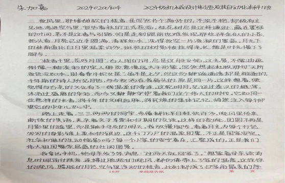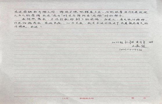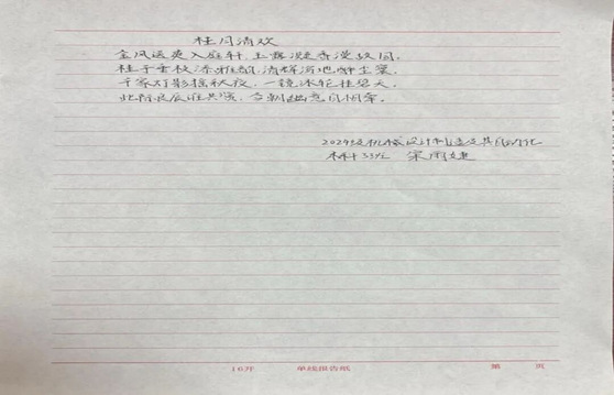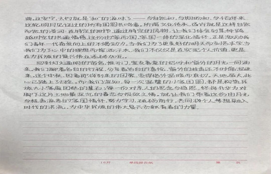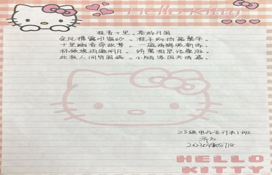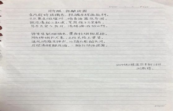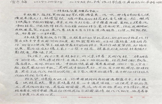 同学们笔下流淌的文字,正悄然生长成最动人的风景。有人伏案写下月下与家人通话的细碎温暖,听筒里的叮咛、屏幕那头的笑脸,都化作质朴的文字在纸页间流转。有人则将校园里的桂树、路灯揉进诗行,细碎的金桂落满笔尖,昏黄的灯光漫过诗行,把异乡的中秋过出了独有的清欢与韵味。这些散文与诗歌,没有华丽辞藻的堆砌,却字字句句都藏着最真挚的情感。