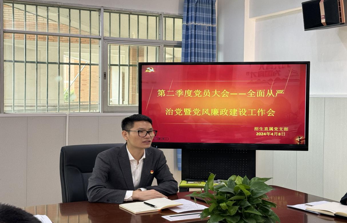为全面贯彻落实党的二十大和二十届二中全会精神,深入学习贯彻习近平总书记关于党的自我革命的重要思想和考察江西重要讲话精神,坚决落实全面从严治党战略方针,4月8日上午,招生直属党支部召开2024年全面从严治党暨党风廉政建设工作会,校党委委员、董事长助理、校长助理乐俊杰到会指导,招生就业直属党支部全体党员、入党积极分子参会,会议由支部书记谢浓主持。