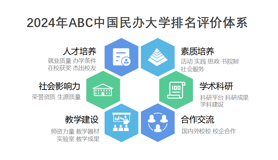 为发现优秀高校,针对含多维度指标、大量研究对象时,ABC排名一贯坚持分段分类分析,主要排名均建立在同年度评级结果基础上;延续本科生教育、研究生教育统筹考虑(应用型高校除外),总量和均量兼顾;同时考虑指标因果逻辑关系,避免完全填空式评价,避免因果指标、不同量纲指标简单赋权相加堆砌导致评价结果失真。本年度民办大学评价指标共设六大模块,分别为人才培养、社会影响力、教学建设、素质培养、学术科研和合作交流。