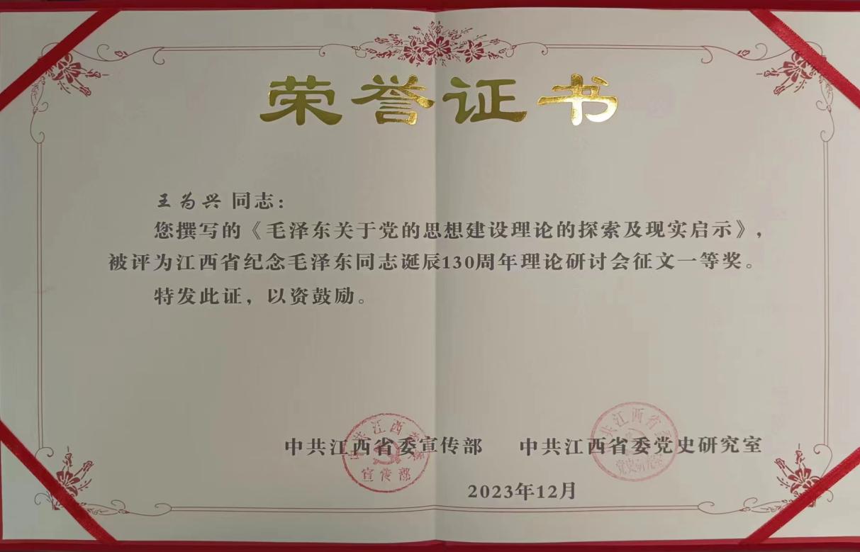 此次王为兴老师的论文被中共江西省委宣传部和中共江西省委党史研究室评为江西省纪念毛泽东同志诞辰130周年理论研讨会征文一等奖。不仅充分展现了我校思政教师踏实严谨的治学态度,认真专一的学术品格,也深深体现了我校思政教师刻苦钻研,勤奋进取的精神风貌。必将鼓舞更多江工老师在学术上建新功!