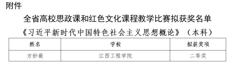 近日,江西省教育厅发布了《关于全省高校思政课和红色文化课程教学比赛结果的公示》,根据公示名单,我校马克思主义学院方妙薇教师荣获《习近平新时代中国特色社会主义思想概论》课(本科组)二等奖。