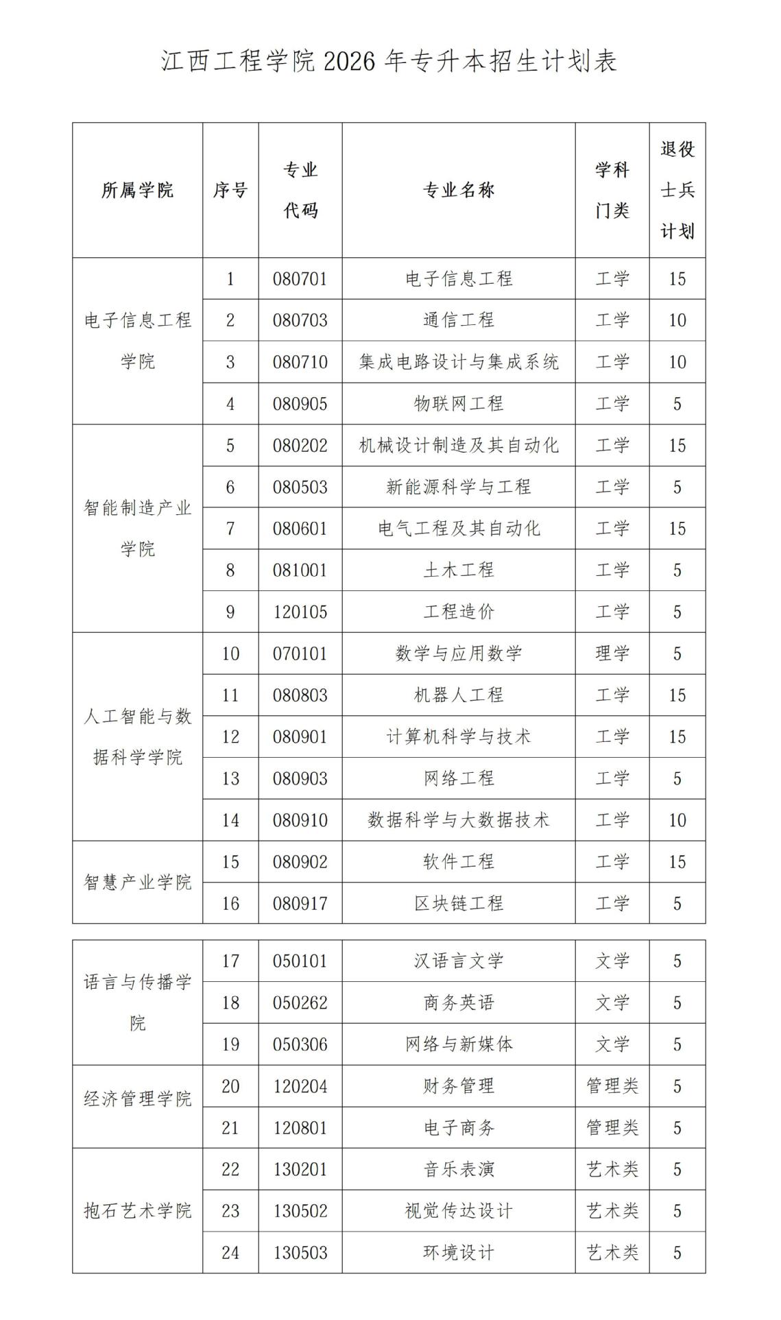 学校2026年退役大学生士兵专升本免试录取招生计划数以省教育厅公布为准